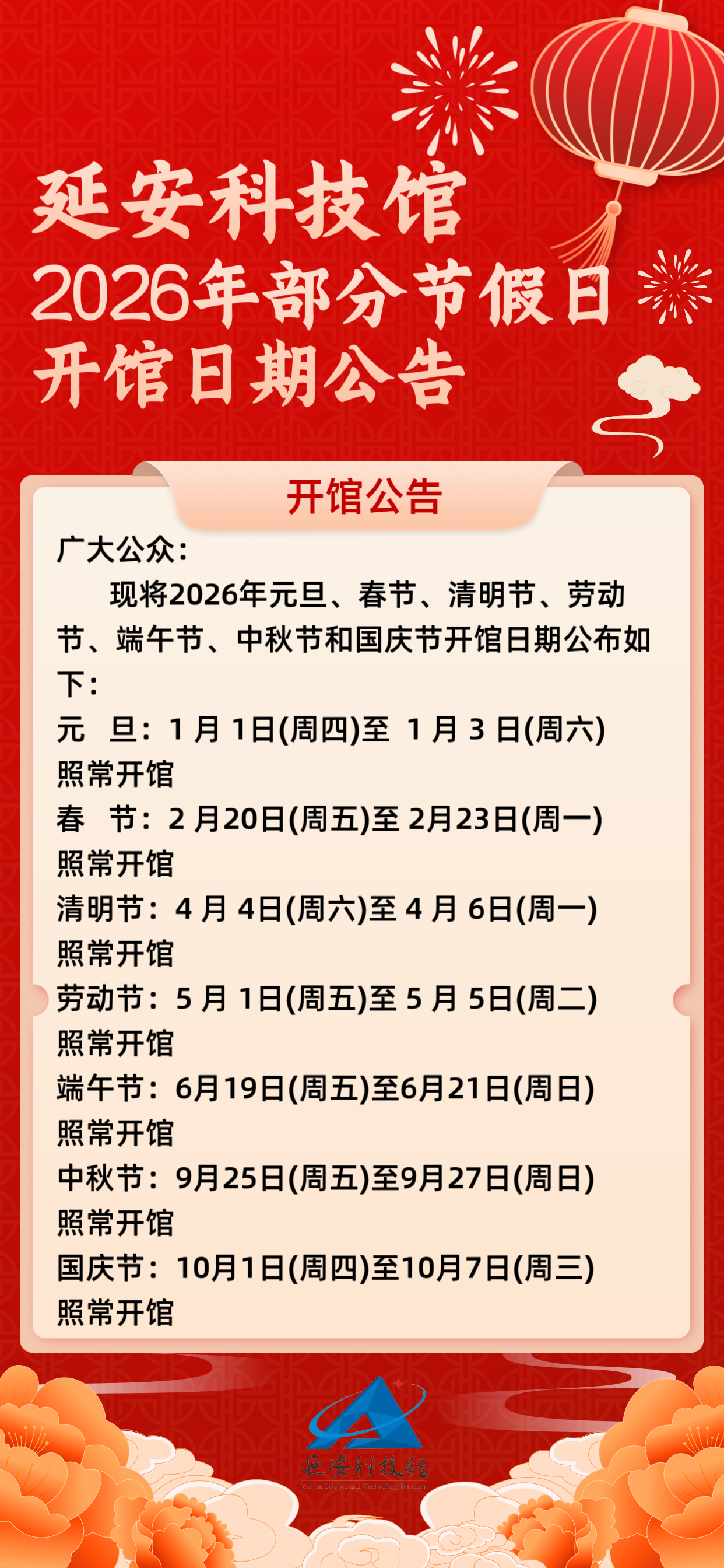 延安科技馆2026年部分节假日开馆日期公告
